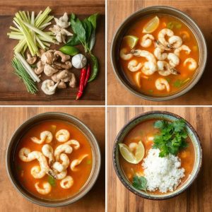 Tom Yum Goong er en ikonisk thailandsk suppe kjent for sin eksplosive kombinasjon av krydret, syrlig og aromatisk smak. Navnet “Tom Yum” betyr “kokt blanding,” mens “Goong” refererer til rekene som er en hovedingrediens. Suppen har sin opprinnelse i det sentrale Thailand, der ferske urter og krydder som sitrongress, galangal og kaffirlimeblader er en del av dagliglivet. Retten har blitt en favoritt over hele verden og er ofte det første mange prøver når de oppdager thailandsk mat.