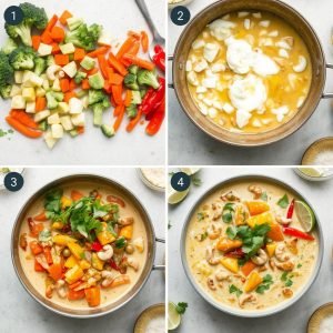 - Kok grønnsakene: Tilsett paprika, brokkoli og gulrøtter i gryten, og la det frese i et par minutter. Hell over kokosmelk og grønnsaksbuljong.