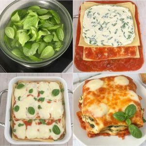 - Montering: Forvarm ovnen til 200°C. Legg et lag tomatsaus i bunnen av en ildfast form, etterfulgt av lasagneplater, spinatfyll, bechamelsaus og revet ost. Gjenta lagene og avslutt med bechamelsaus og ost.