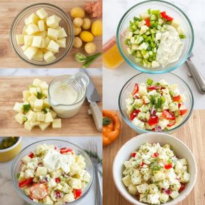 - Kok potetene: Skyll potetene godt og kok dem med skall i lettsaltet vann i ca. 20 minutter, eller til de er møre. Avkjøl og skjær i terninger.