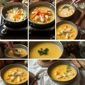 Fiskesuppe med safran er en elegant og smakfull rett som kombinerer det beste av havets råvarer med en varm og aromatisk buljong. Safran tilfører suppen en gyllen farge og en subtil krydret smak, mens fisk og skalldyr gir fylde og rikdom. Jeg elsker denne suppen for dens luksuriøse karakter og hvordan den føles som en fest på tallerkenen.
