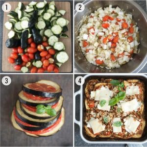 - Bygg gratengen: Legg et lag med stekte aubergineskiver i bunnen av en ildfast form. Hell over tomatsausen og legg et nytt lag med aubergine på toppen. Gjenta prosessen til alle ingrediensene er brukt opp.