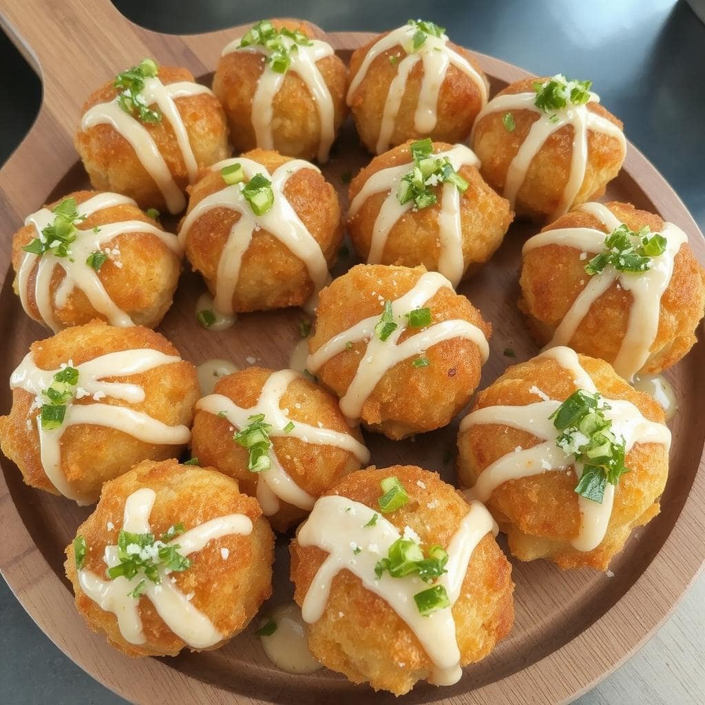 - Overfør takoyaki til et serveringsfat. Topp med takoyakisaus, majones, bonito-flak og aonori.