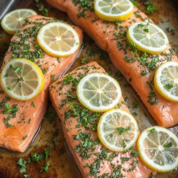 Denne bakte laksen er en smakfull, saftig og sunn rett som kombinerer fersk laks med en aromatisk blanding av urter og sitronskiver. Når laksen bakes, frigjør den naturlige safter som blander seg med de friske urtene og sitronsaften, og gir en herlig smak. Resultatet er en mør og flakete fisk som nærmest smelter i munnen, samtidig som den fyller rommet med en forfriskende duft av sitrus og urter.