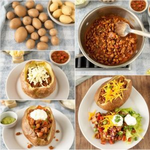 - Monter retten: Skjær et kryss på toppen av de bakte potetene og klem dem lett sammen for å åpne dem. Fyll hver potet med chili con carne.