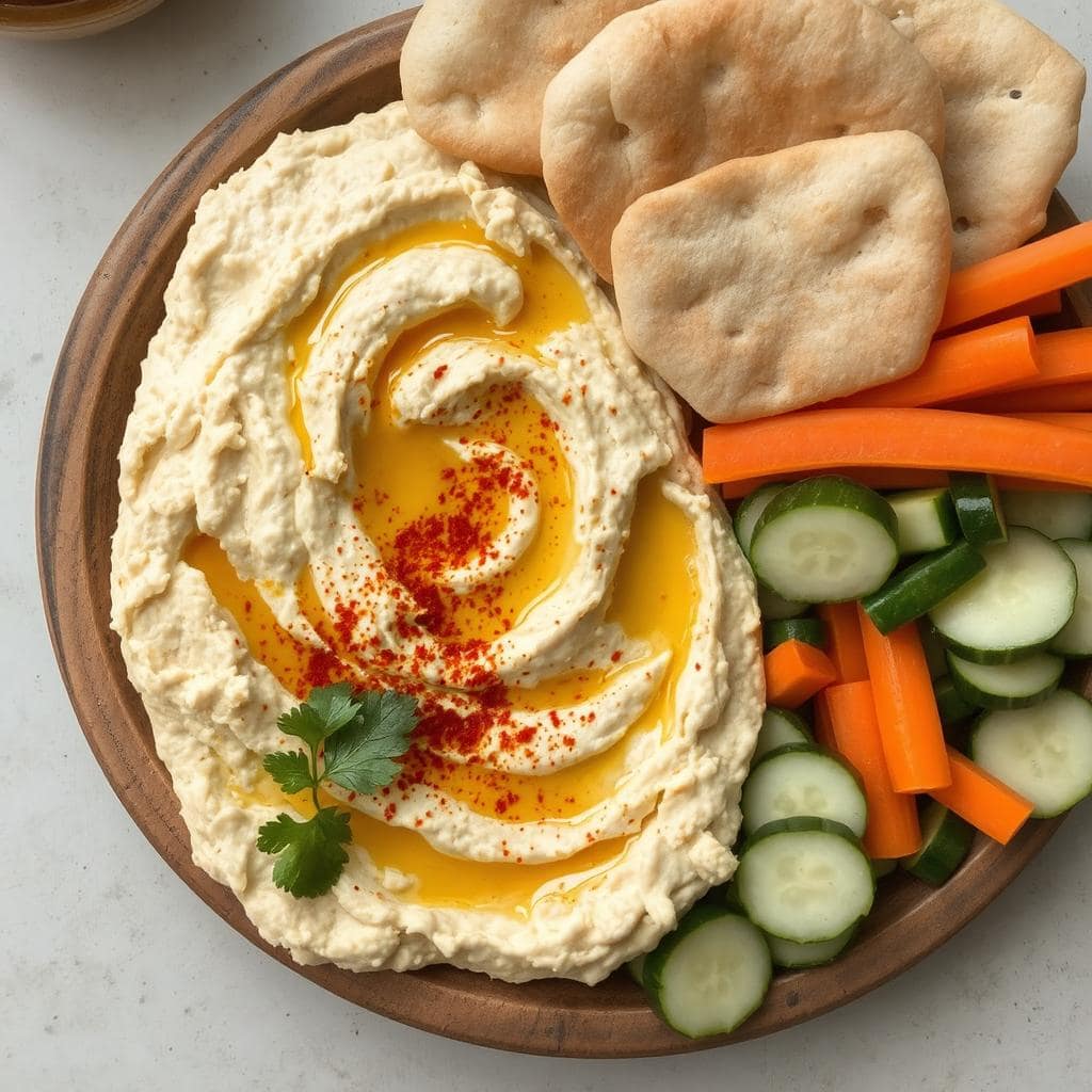 Hummus med pitabrød er en tidløs rett fra det østlige Middelhavet som kombinerer silkemyk hummus med myke, varme pitabrød. Hummus lages av kikerter, tahini, hvitløk og sitron, og er både næringsrik og lett å lage. Jeg elsker denne retten for dens allsidighet – den kan serveres som forrett, snacks eller en lett hovedrett.