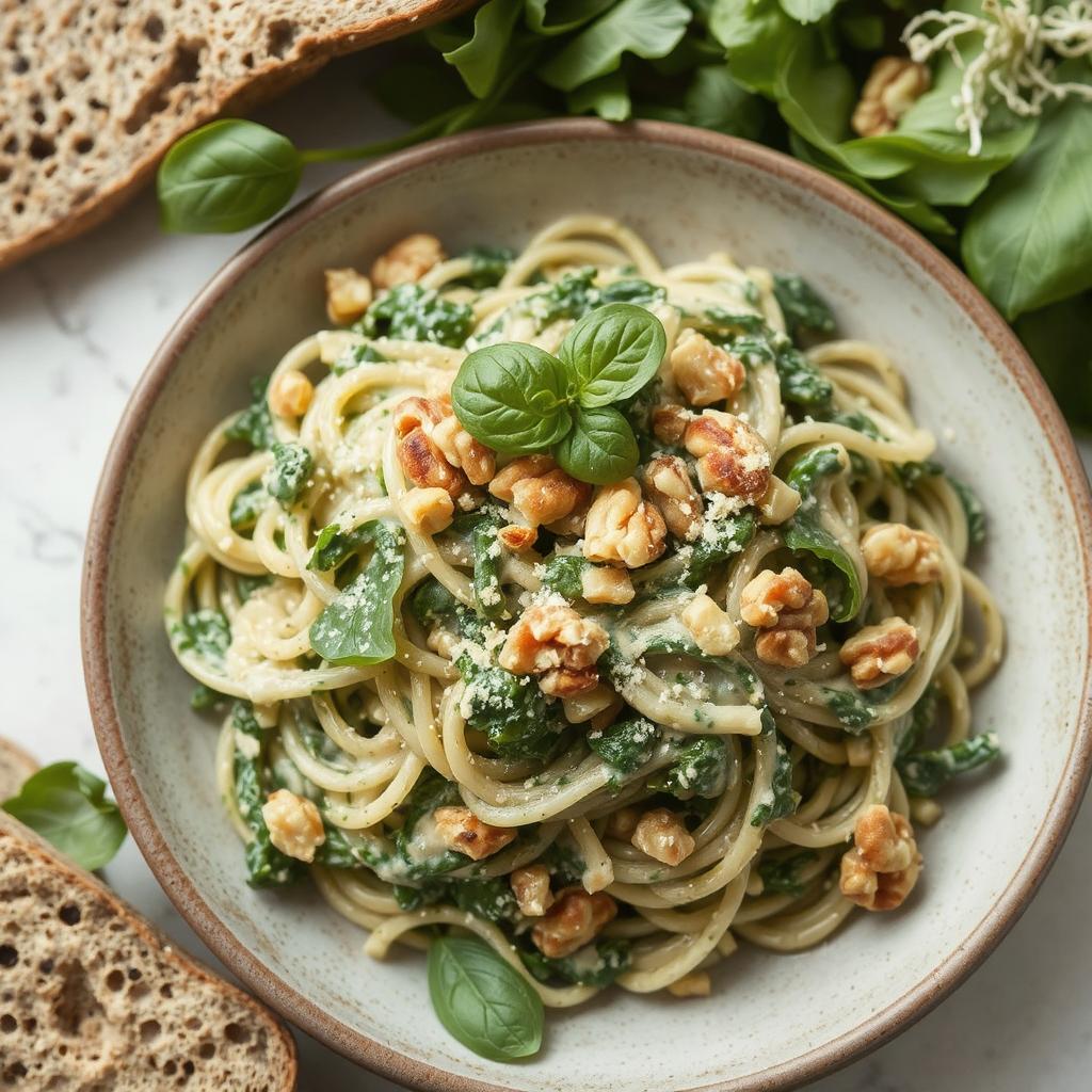 Kremet pasta har alltid vært en klassiker i det italienske kjøkkenet. Tradisjonelt er slike sauser basert på rikelige mengder smør og fløte, men det finnes heldigvis sunnere og lettere alternativer. Jeg har latt meg inspirere av den enkle, men smakfulle kombinasjonen av spinat og kremet saus – en rett som er elsket i alt fra italienske trattoriaer til moderne vegetarvennlige restauranter. Min versjon er laget med havrefløte i stedet for vanlig fløte, og næringsgjær gir den deilige ostete smaken uten å bruke parmesan. Ristede nøtter tilfører en fin kontrast i tekstur, og resultatet er en sunnere, men likevel uimotståelig pastarett.