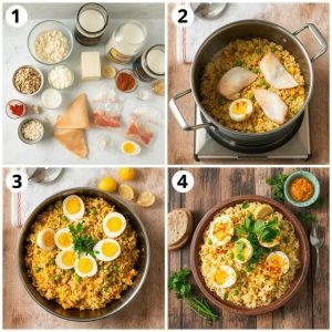 • Server kedgeree med kokte egg, sitronbåter og et dryss frisk koriander.
