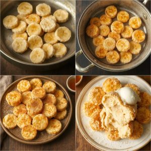 - Forbered bananene: Del bananene på langs. Dypp hver bananbit i røren til den er jevnt dekket.