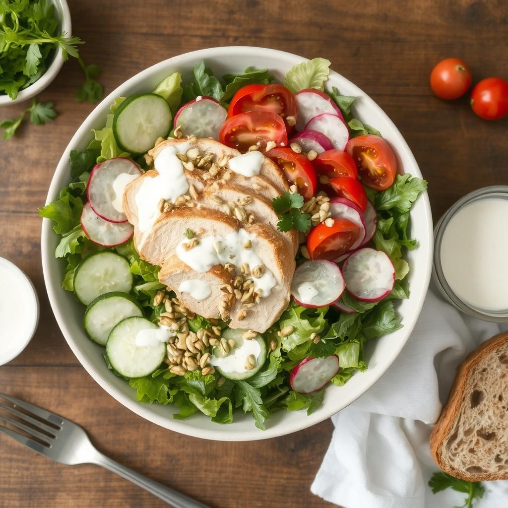 Denne kyllingsalaten er en perfekt balanse mellom friskhet, saftighet og kremet dressing. Den saftige, krydrede kyllingen tilfører en mild varme med smaker av paprika og hvitløk. Grønnsakene, som sprø salatblader, saftige tomater og knasende agurk, gir salaten en herlig variasjon i tekstur. Dressingen, laget av gresk yoghurt, sitronsaft og en liten dæsj honning, har en silkemyk og syrlig smak som binder alle ingrediensene sammen. Et dryss av ristede gresskarkjerner på toppen gir en nøtteaktig crunch og løfter smaken til nye høyder. Hver munnfull er en oppfriskende og smakfull opplevelse.