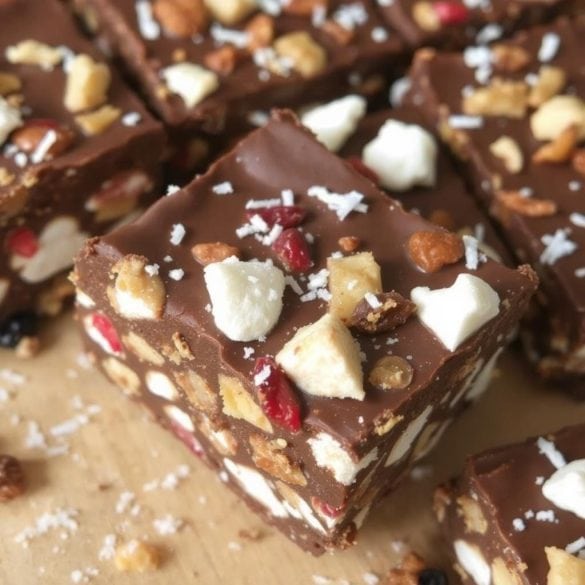 Rocky Road er en favoritt hjemme hos meg, spesielt når jeg vil lage noe raskt til en sammenkomst eller helgekos. En gang brukte jeg tørkede tranebær i blandingen for en syrlig vri – det ble en stor suksess! Mitt beste tips er å bruke sjokolade av god kvalitet og tilpasse oppskriften med favorittingrediensene dine. Oppbevar godbitene i kjøleskapet for en fastere konsistens.