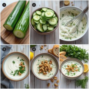 • Fordel suppen i skåler. Topp med hakkede valnøtter, ekstra dill og agurkskiver.