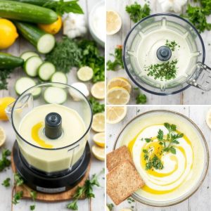 • Bland ingrediensene: Ha agurk, gresk yoghurt, vann, olivenolje, sitronsaft, hvitløk, salt og pepper i en blender. Kjør til en jevn, silkemyk konsistens.