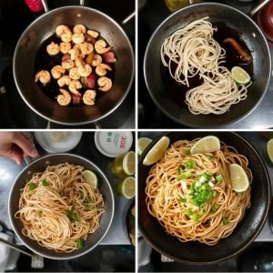 - Tilsett bønnespirer og vårløk. Stek i ytterligere 1–2 minutter til alt er godt blandet og nudlene er varme.