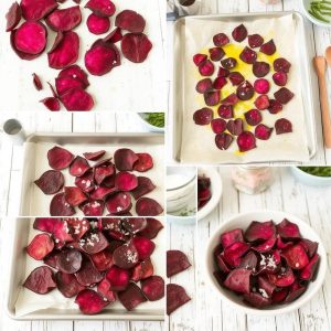 - I ovn: Forvarm ovnen til 180 °C. Legg rødbetskivene på en bakeplate med bakepapir i ett lag. Stek i 15–20 minutter, vend dem halvveis. Pass på så de ikke blir brent.