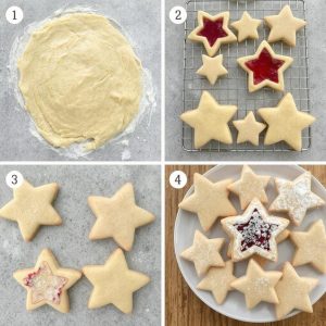 - Montering: Smør et tynt lag med syltetøy på den flate siden av en hel stjerne. Legg en stjerne med vindu på toppen og trykk lett sammen.