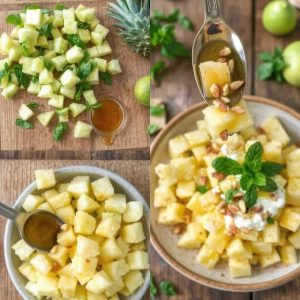 Denne ananassalaten er en eksplosjon av friskhet! Den saftige ananasen gir naturlig sødme, mens limesaften tilfører en syrlig kontrast som fremhever fruktens smak. Mynte gir en kjølende og aromatisk dybde, noe som gjør salaten ekstra forfriskende. De ristede mandlene tilfører en sprø tekstur, mens yoghurten gir en myk og kremet finish. Det hele balanseres med en lett sødme fra honning, som runder av smaken på en naturlig måte. Jeg elsker hvordan alle elementene harmonerer og gir en lett, men tilfredsstillende følelse i munnen!