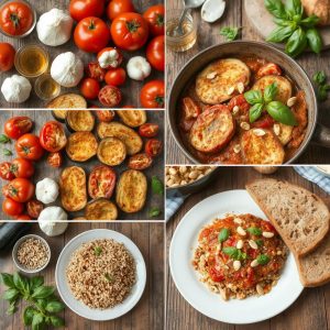 Auberginen blir silkemyk og nesten kremet etter baking. Den karamelliserte overflaten gir en lett sødme som balanseres av en frisk og krydret tomatsaus. Krydder som hvitløk, oregano og chili gir retten en aromatisk dybde, mens kikerter tilfører en fast og tilfredsstillende tekstur. Pinjekjerner gir en sprø kontrast, og friske urter som basilikum eller persille løfter smaken. Jeg elsker hvordan retten smelter sammen i en harmonisk blanding av mykt, saftig og sprøtt, samtidig som den er lett og sunn.