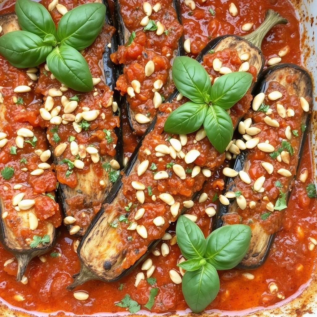 Auberginen blir silkemyk og nesten kremet etter baking. Den karamelliserte overflaten gir en lett sødme som balanseres av en frisk og krydret tomatsaus. Krydder som hvitløk, oregano og chili gir retten en aromatisk dybde, mens kikerter tilfører en fast og tilfredsstillende tekstur. Pinjekjerner gir en sprø kontrast, og friske urter som basilikum eller persille løfter smaken. Jeg elsker hvordan retten smelter sammen i en harmonisk blanding av mykt, saftig og sprøtt, samtidig som den er lett og sunn.