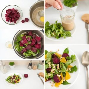 Skrell rødbetene etter at de er kokt, og skjær dem i biter eller tynne skiver. La dem avkjøles litt før du fortsetter. - Lag dressingen: