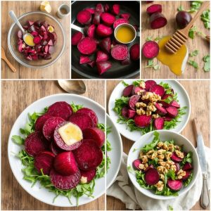 Kort Historie: Rødbetesalat har vært en fast favoritt i både hverdags- og høytidsmåltider. Når den kombineres med en søt honningdressing, får rødbetene en nydelig kontrast som fremhever deres naturlige sødme. Jeg elsker hvordan denne retten både ser vakker ut og smaker fantastisk.