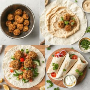 - Legg på 3–4 falafler per wrap, topp med tahinidressing eller yoghurtsaus.
