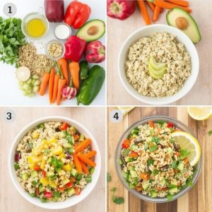 - Montering av salatbollen: Legg quinoaen i bunnen av en stor bolle. Fordel grønnsakene jevnt over. Topp med avokado og dryss ristede mandler eller solsikkefrø.