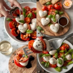 Caprese-salat har alltid vært en favoritt hos meg, særlig om sommeren når tomatene smaker best. Første gang jeg laget denne hjerteformede varianten var til en romantisk middag hjemme, og den ble umiddelbart en suksess. Jeg har lært at ferske ingredienser er nøkkelen – en god mozzarella og søte, modne tomater løfter smaken enormt. Et godt tips er å bruke en skarp, liten kniv eller en utstikker for å forme mozzarellaen til hjerter. Når jeg serverer denne retten, liker jeg å legge på et par ristede pinjekjerner for litt ekstra crunch, eller noen dråper trøffelolje for en luksuriøs vri.