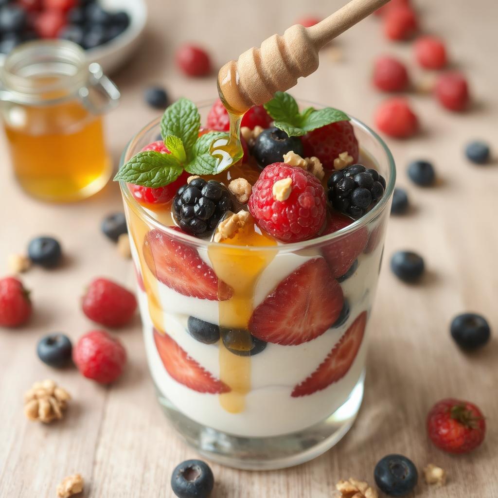 Denne desserten byr på en deilig kombinasjon av kremete og friske smaker. Cottage cheese gir en mild, syrlig base som balanseres perfekt av sødmen fra honning. Friske bær som blåbær og jordbær tilfører saftighet og naturlig sødme, mens valnøtter gir en spennende, sprø kontrast. Sitronens hint av friskhet hever smaken ytterligere og gir desserten en elegant og balansert avslutning. Når jeg spiser denne desserten, elsker jeg hvordan hver bit gir en ny tekstur, fra det myke og kremete til det knasende og friske.