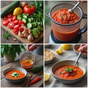 Gazpacho smaker rett og slett som sommer på skje! Den er sval og forfriskende med en naturlig sødme fra modne tomater og paprika, og en lett syrlighet fra sitron. Konsistensen er glatt og silkemyk, med små biter av agurk og paprika på toppen som gir litt crunch og variasjon. Jeg bruker gjerne litt spisskummen og røkt paprika for dybde i smaken – det gir et lite hint av varme som balanserer det kalde og friske. Hver munnfull føles både lett og mettende – akkurat slik jeg liker det.