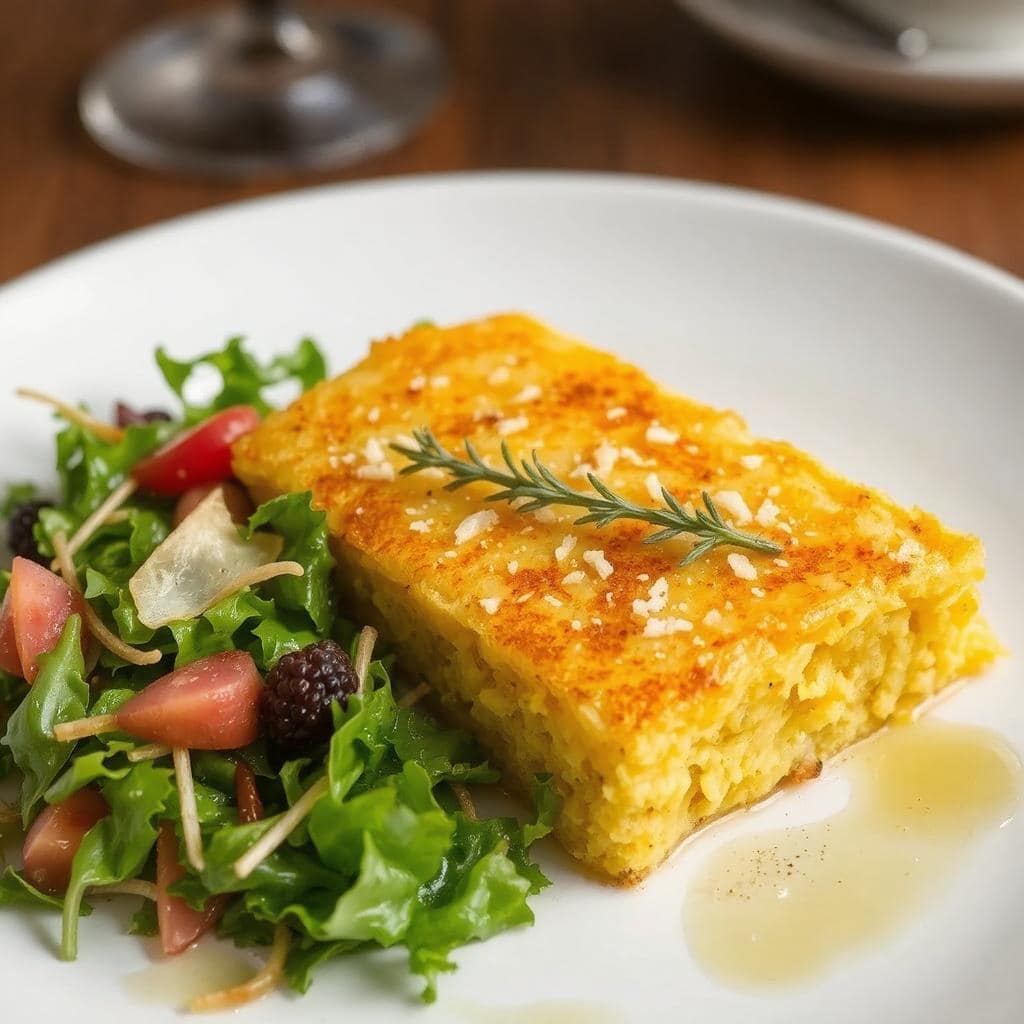 Gratinert polenta med parmesan byr på en silkemyk tekstur som smelter i munnen. Den kremete polentaen balanseres perfekt av parmesans intensitet, med sin nøtteaktige og salte smak. En sprø og gyllen overflate etter gratinering gir retten en herlig kontrast. Små hint av hvitløk og smør tilfører dybde og rikdom, mens den milde sødmen fra melken harmoniserer smaken.