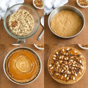 Denne kaken med karamell og nøttebunn har røtter i tradisjonelle desserter. Min bestemor serverte lignende kaker, men jeg har gjort den sunnere. Havremel og kokosolje erstatter hvetemel og smør. Resultatet er lettere, men like smakfullt. Kaken har blitt en favoritt fordi den er enkel og smakfull. Den passer perfekt til både hverdags og spesielle anledninger.
