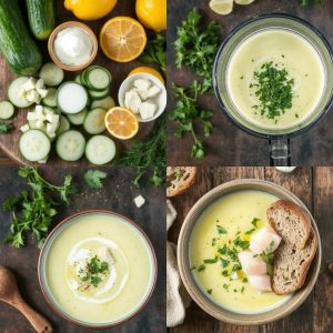 - Lag suppen: Ha agurk, yoghurt, vann, olivenolje, sitronsaft, hvitløk og salt i en blender. Kjør til en jevn og kremet konsistens.