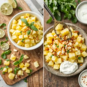Denne salaten er en skikkelig smaksbombe. Den saftige og søte ananasen får et syrlig løft fra lime, mens mynte tilfører en kjølende friskhet. En liten skvett honning gir rundhet i smaken, og de ristede nøttene gir en deilig sprø kontrast.