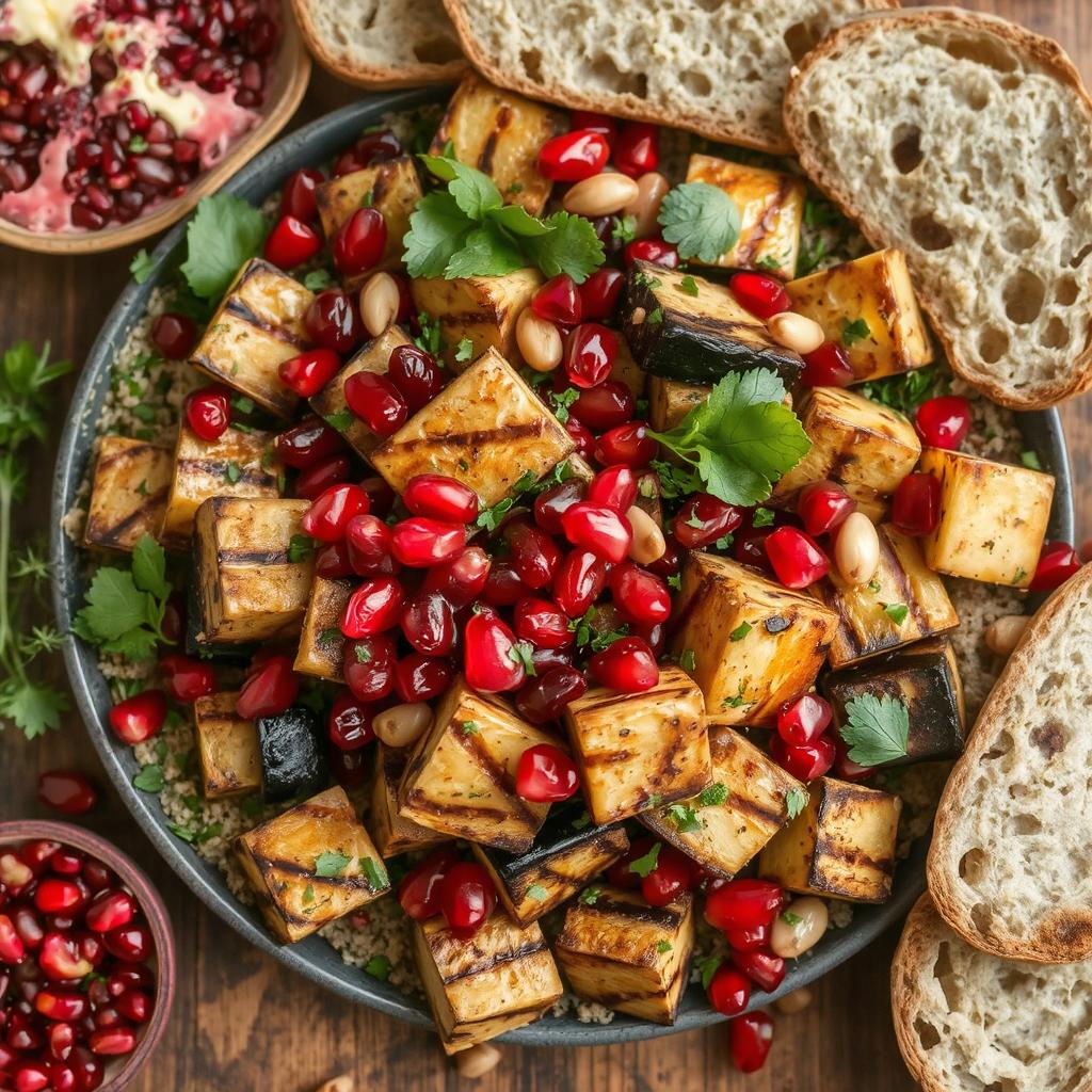 Aubergine har lenge vært en viktig ingrediens i middelhavskjøkkenet. Den brukes i alt fra kremete dipsauser til varme retter, men jeg elsker den kanskje aller mest i en frisk salat. Første gang jeg smakte en slik rett var på en sommerferie i Hellas. Der fikk jeg servert grillede auberginer blandet med friske urter, sitron og granateple. Det var en perfekt balanse mellom sødme, syrlighet og fylde. Etter hjemkomsten begynte jeg å eksperimentere med min egen versjon, med litt ekstra krydder og sprø elementer. Nå lager jeg denne retten ofte, både som lett hovedrett og som tilbehør til større måltider.