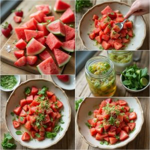 Denne salaten er et friskt pust i munnen! Vannmelonen er søt og saftig, nærmest sprø i konsistensen, og jordbærene gir en dypere sødme og mykere tekstur. Myntebladene tilfører en kjølig friskhet, og limejuicen binder det hele sammen med en syrlig, oppkvikkende smak. Det er noe utrolig tilfredsstillende med den balansen – søtt, syrlig og aromatisk på én gang. Dressingen er enkel, men løfter alt. Jeg synes også det lille drysset med limeskall gjør hele forskjellen – det lukter sommer, og det smaker sommer.