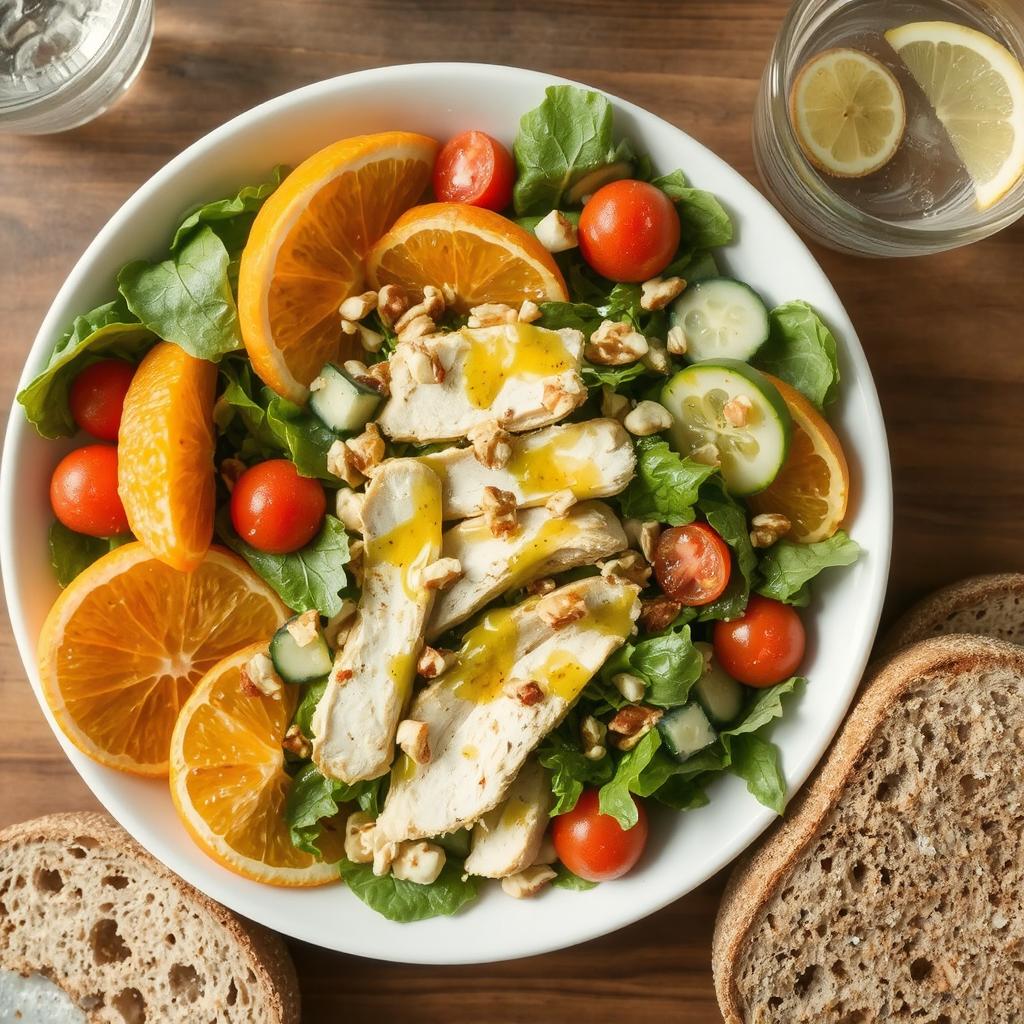 Denne oppskriften stammer fra en dag jeg ønsket noe lett, sunt og raskt til lunsj. Jeg har alltid elsket kombinasjonen av friske grønnsaker, saftig kylling og en syrlig dressing. Ideen fikk jeg etter en tur til Middelhavet, hvor sitrusfrukter og nøtter ofte ble brukt i salater. Den ble raskt en favoritt hjemme, fordi den er så enkel å lage og kan tilpasses med det du har i kjøleskapet. Nå er den mitt “go-to”-alternativ når jeg vil ha en sunn og smakfull lunsj som ikke krever mye tid.