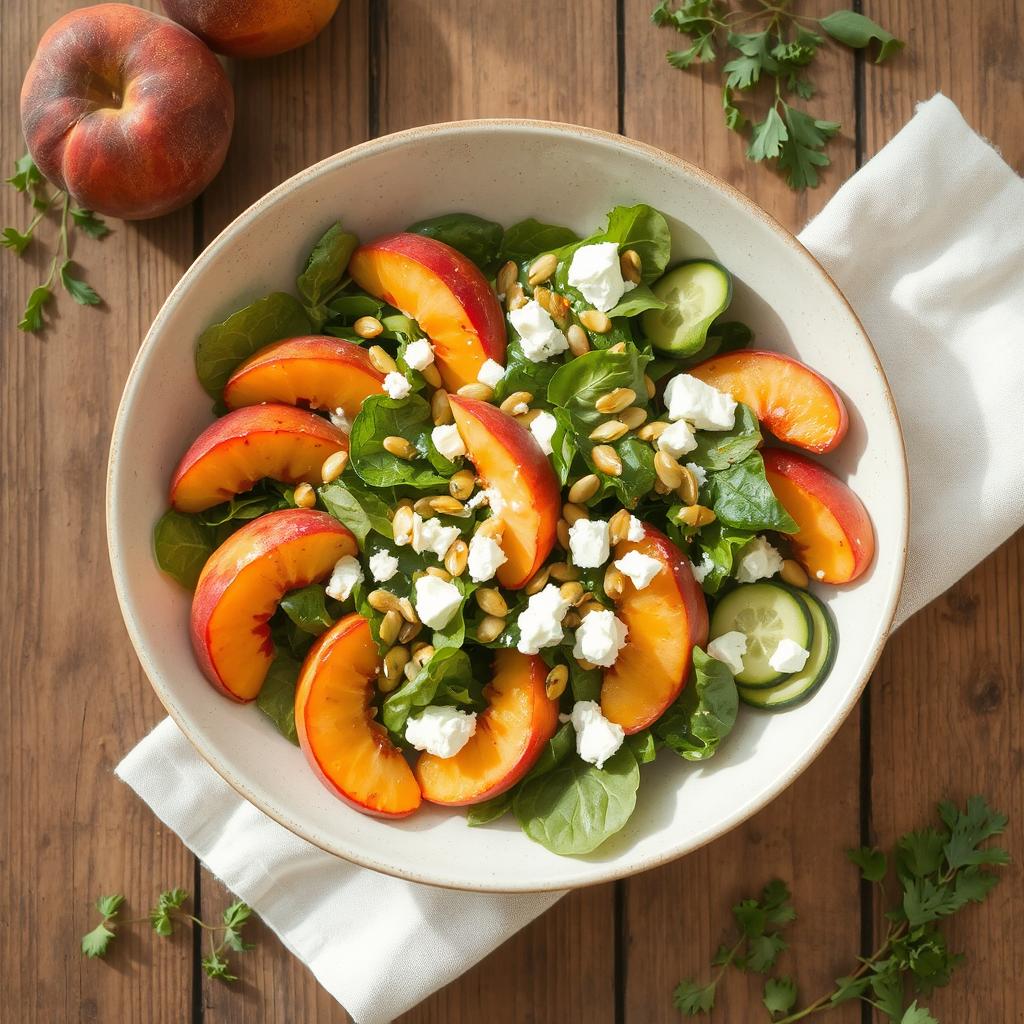 Denne salaten er et lite mesterverk av balanse. Saftige nektariner gir sødme og en florlett fruktighet, mens fetaosten smelter kremete og salt i munnen. Spinat og ruccola bringer friskhet og en anelse bitterhet, som gjør smaken voksen og nyansert. Agurken gir en ren, sprø kontrast, og de ristede gresskarkjernene knaser lett og gir dybde. Dressingen, med sitron, olivenolje og et snev honning og sennep, løfter alt sammen. Duften er blomstrete og frisk, som en solfylt morgen på landet. Dette er mat som gjør meg glad – og som jeg gjerne deler med andre.