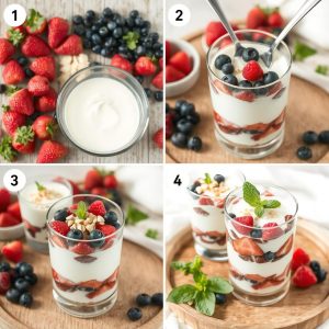 Jeg lager denne desserten hele året, men den smaker aller best om sommeren når bærene er på sitt søteste. Jeg bruker det jeg har – jordbær, bringebær, blåbær eller til og med moreller. Når jeg skal gjøre den ekstra fin til gjester, serverer jeg den i små glass og topper med mynte og litt limeskall. Jeg har også prøvd å lage den med gresk yoghurt og et snev av kardemomme – det ble også kjempegodt. En gang lagde jeg den som frokostvariant med havregryn i bunnen, og det ble faktisk en liten suksess her hjemme. Det er en dessert som tilpasser seg anledningen – og det liker jeg!
