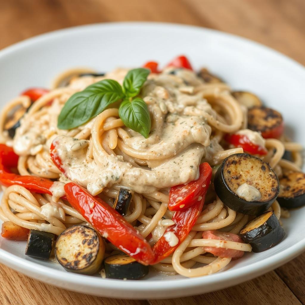 - Bland pastaen og grønnsakene: Når sausen er ferdig, tilsett pastaen og de grillede grønnsakene i pannen. Rør forsiktig til alt er godt blandet og dekket med sausen.