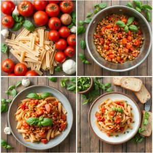 Pasta med tomatsaus og linser er en enkel og smakfull rett som kommer fra det italienske kjøkken, men med et sunt preg ved bruk av linser som plantebasert proteinkilde. Denne retten ble først populær som et raskt og mettende måltid, ideell for både hverdager og når man vil lage noe næringsrikt. Linsene gir sausen både fylde og en deilig tekstur, og sammen med tomatenes friske syre og krydderne får man en rett som både voksne og barn setter pris på. Jeg elsker denne retten for at den både er rask å lage og utrolig tilfredsstillende.