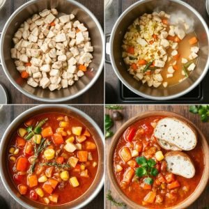 - Bygg sausen: Tilsett tomatpuré, hakkede tomater, og kyllingkraft. Rør inn krydderne og la det småkoke.