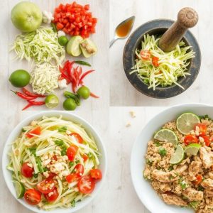 Green papaya salad, også kalt Som Tum, er en klassisk thailandsk rett. Den kombinerer syrlige, søte og krydrede smaker med sprø papaya og smakfull dressing. Retten passer som forrett eller tilbehør til grillet kjøtt. Jeg elsker denne salaten for dens friske smak og balanserte teksturer.