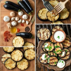 - Grill auberginen: Forvarm grillen til middels høy varme. Legg aubergineskivene på grillristen og grill i 3-4 minutter på hver side, eller til de får fine grillmerker og er gjennomstekte.
