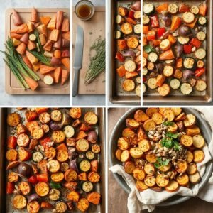 - Forbered grønnsakene: Skyll og kutt søtpoteter, gulrøtter, paprika, squash og rødløk i omtrent like store biter for jevn steking.