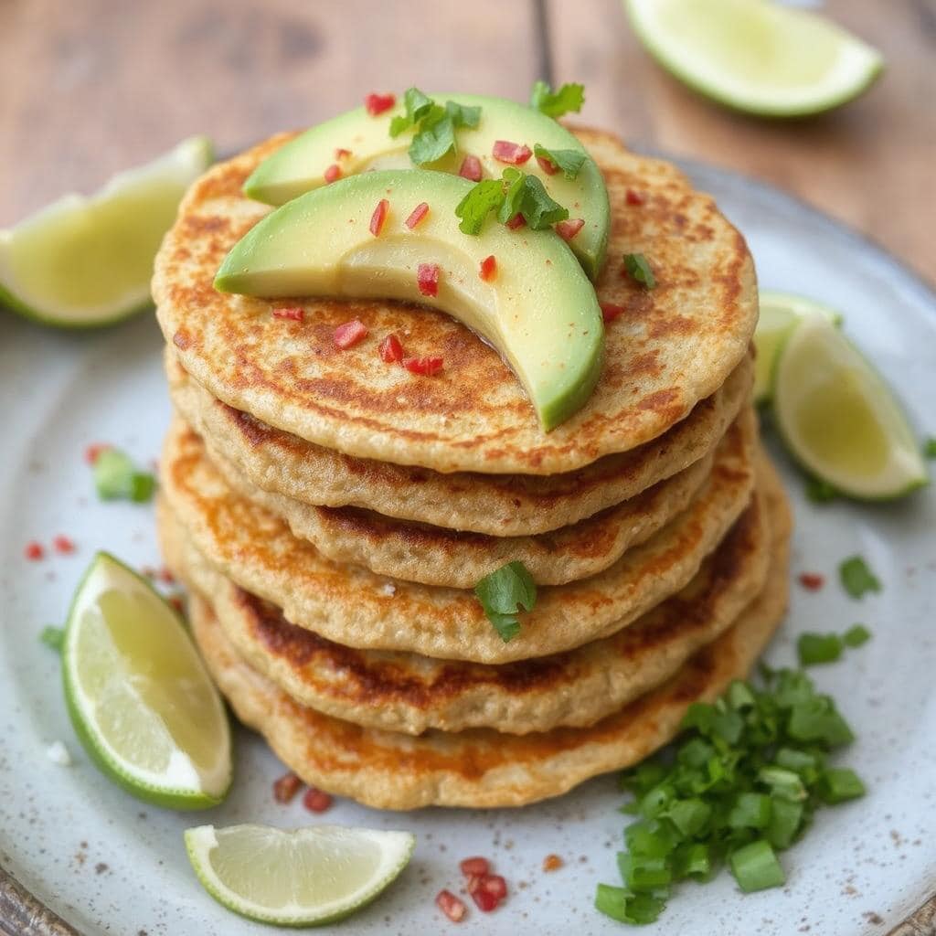 - Legg pannekakene på en tallerken, topp med avokadoskiver, chiliflak og ferske urter. Server straks.