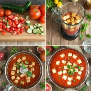 - Ha tomater, agurk, paprika, rødløk og hvitløk i en blender. Tilsett olivenolje, rødvinseddik og kaldt vann.