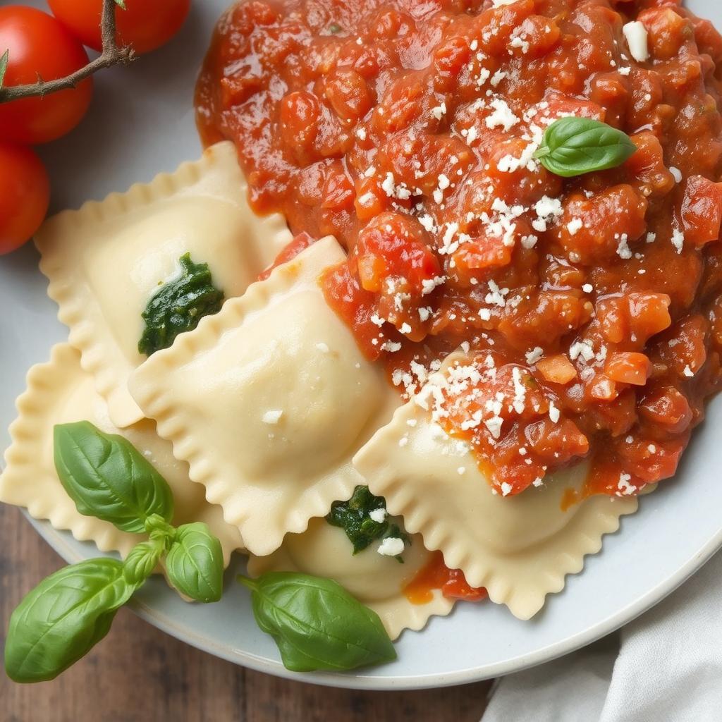 - Server: Server raviolien med tomatsausen og et lett dryss parmesan.