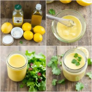 Mål opp honning, dijonsennep, olivenolje, sitronsaft og eplecidereddik. Finn frem en liten bolle og visp. - Visp sammen: