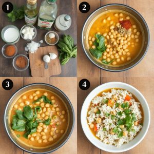 - Kikerter og spinat: Ha kikertene i gryten og la det koke i 10 minutter. Tilsett spinaten helt på slutten og la den falle sammen.